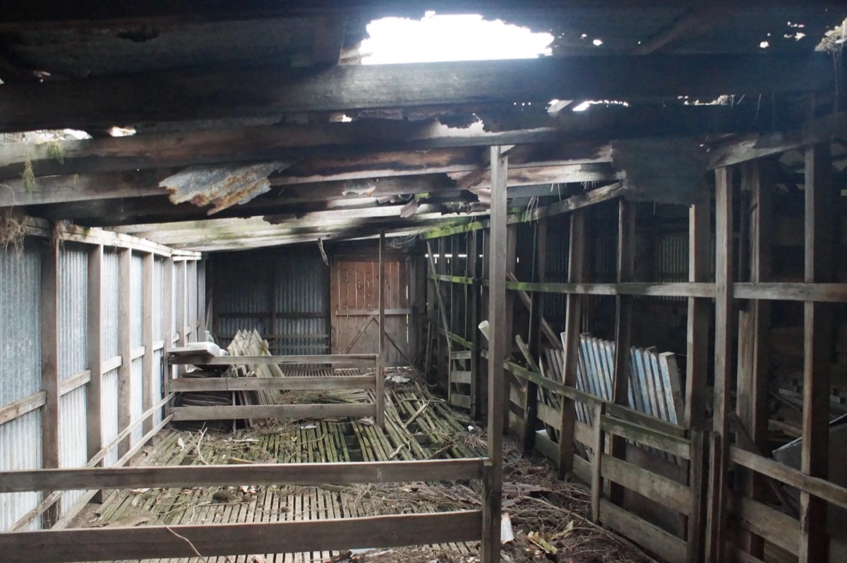 • Cleaning up of the west section where building debris and tree debris was collecting in the interior and removal of the worst of the flooring.
